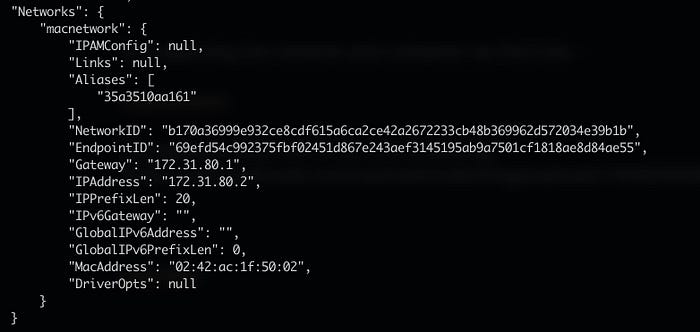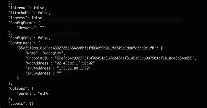 docker run -d --name macnginx --network macnetwork nginxOn inspecting the network and container we find that: